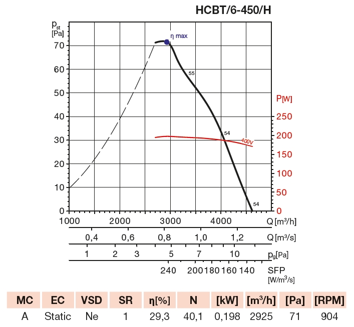 | otáčky [min-1] | průtok (0 Pa) [m3/h] | příkon [W] | napětí [V] | proud [A] | max. teplota [°C] | akust. tlak [dB(A)] | hmotnost [kg] | regulátor |