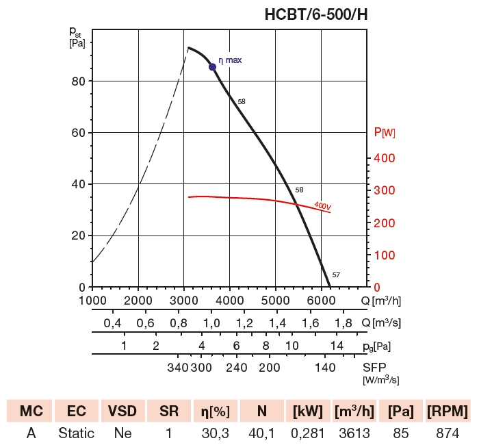 | otáčky [min-1] | průtok (0 Pa) [m3/h] | příkon [W] | napětí [V] | proud [A] | max. teplota [°C] | akust. tlak [dB(A)] | hmotnost [kg] | regulátor |