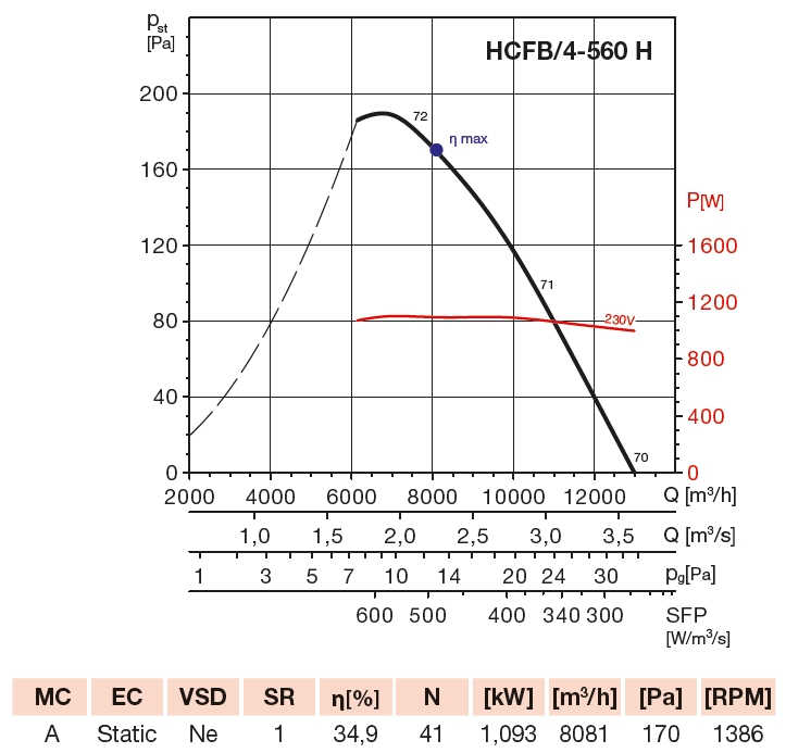 | otáčky [min-1] | průtok (0 Pa) [m3/h] | výkon [W] | napětí [V] | proud [A] | max. teplota [°C] | akust. tlak [dB(A)] | hmotnost [kg] | regulátor |