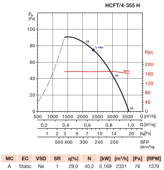 | otáčky [min-1] | průtok (0 Pa) [m3/h] | výkon [W] | napětí [V] | proud [A] | max. teplota [°C] | akust. tlak [dB(A)] | hmotnost [kg] | regulátor |