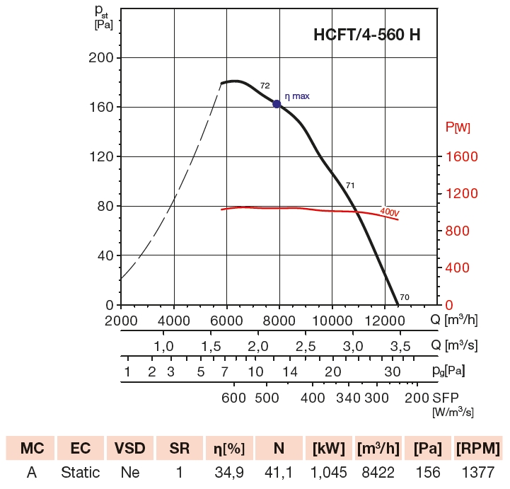 | otáčky [min-1] | průtok (0 Pa) [m3/h] | výkon [W] | napětí [V] | proud [A] | max. teplota [°C] | akust. tlak [dB(A)] | hmotnost [kg] | regulátor |