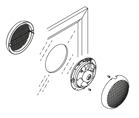 ![]() | Montáž Montuje se na okenní sklo, do panelu (max. tloušťka 8 mm) nebo do zdi, s osou ventilátoru ve vodorovné poloze. | |