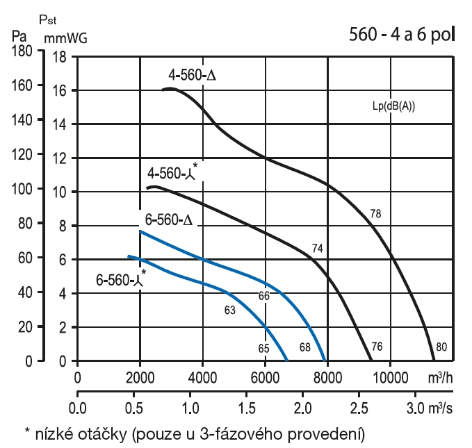 * hodnoty akustického tlaku ve vzdálenosti 1,5 m, ventilátor na střeše; ** vysoké/nízké otáčky při použití přepínače SD 2 (Y/Δ pro motory 3x400 V)
