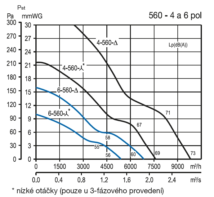 * hodnoty akustického tlaku ve vzdálenosti 1,5 m, ventilátor na střeše; ** vysoké/nízké otáčky při použití přepínače SD 2 (Y/Δ pro motory 3x400 V)