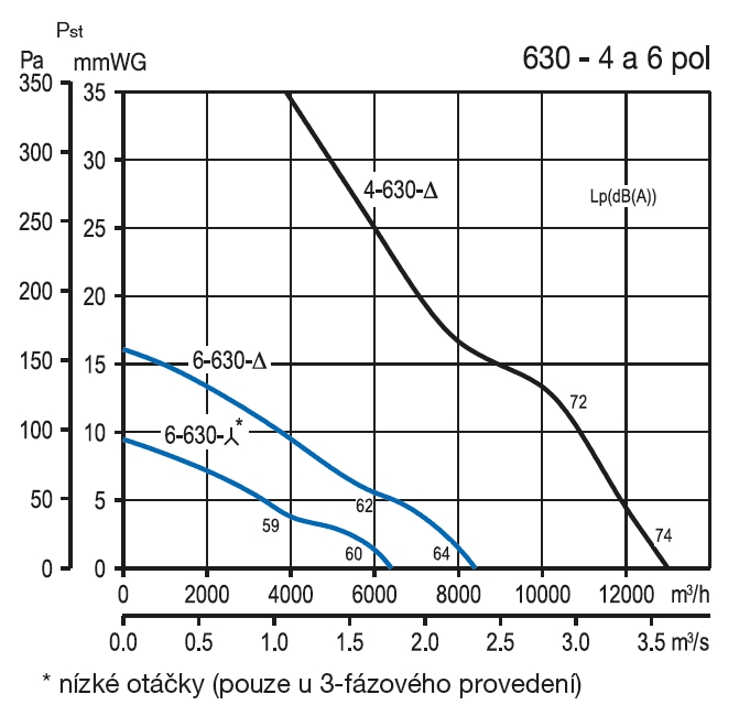 * hodnoty akustického tlaku ve vzdálenosti 1,5 m, ventilátor na střeše; ** vysoké/nízké otáčky při použití přepínače SD 2 (Y/Δ pro motory 3x400 V)