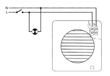 ![]() | Svorkovnice Svorkovnice je přístupná po sejmutí čelní mřížky ventilátoru. Připojení je kabelem pod omítkou nebo po omítce. Svorkovnice obsahuje odlehčovací sponu proti vytržení kabelu. | |