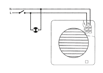 ![]() | Svorkovnice Svorkovnice je přístupná po sejmutí čelní mřížky ventilátoru. Připojení je kabelem pod omítkou nebo po omítce. Svorkovnice obsahuje odlehčovací sponu proti vytržení kabelu. | |