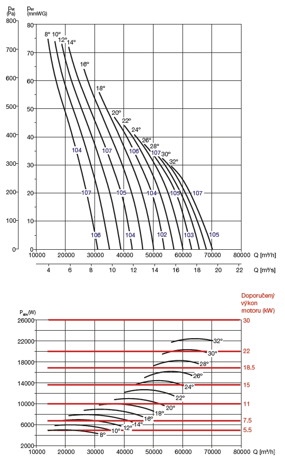 ![]() | Oběžné kolo Oběžné kolo ventilátoru je axiální a je vyrobené z Al slitiny. Oběžné kolo je staticky a dynamicky vyváženo. Nastavení úhlu listů oběžného kola je provedeno výrobcem (8°–32°). | |