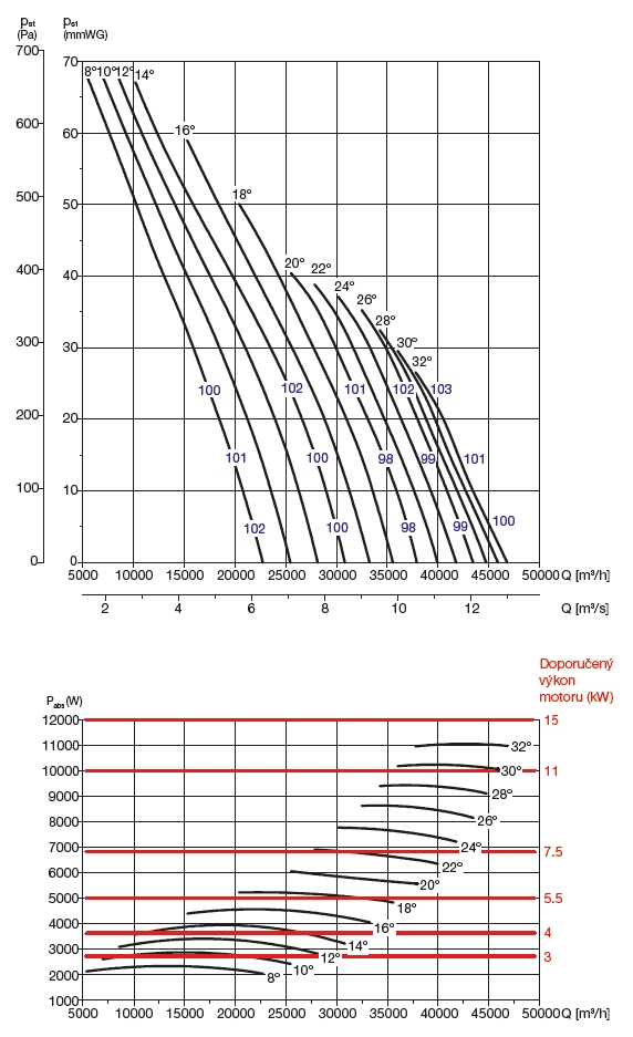 ![]() | Oběžné kolo Oběžné kolo ventilátoru je axiální a je vyrobené z Al slitiny. Oběžné kolo je staticky a dynamicky vyváženo. Nastavení úhlu listů oběžného kola je provedeno výrobcem (8°–32°). | |