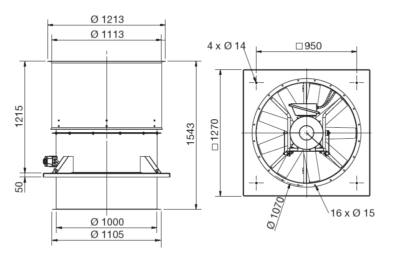![]() | Skříň Skříň je konstruována pro vertikální výfuk vzdušiny. Podstavec i skříň ventilátoru jsou vyrobeny z ocelového plechu opatřeného antikorozní ochranou. Válcová skříň je opatřena šedým epoxidovým lakem. Součástí ventilátoru je zpětná klapka na výtlaku a ochrana před vniknutím cizích těles. | |