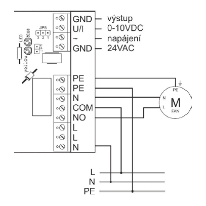 ![]() | Informace • ovládání ventilace, klimatizace a rekuperačních jednotek dle relativní vlhkosti vzduchu • napětí 14–24 V • max. spotřeba 1 VA • proud max. 5 A • pracovní rozsah měření 0–100 % RH • krytí IP20 • analogový napěťový výstup 0–10 V (0–100%) • výstupní relé s nastavitelnou úrovní spínání • montáž na omítku | |