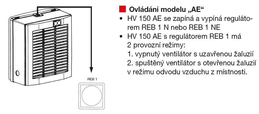 ![]() | Regulace otáček HV 150 AE se zapíná a vypíná regulátorem REB 1 N nebo REB 1 NE a má 2 provozní režimy: 1. vypnutý ventilátor s uzavřenou žaluzií 2. spuštěný ventilátor s otevřenou žaluzií v režimu odvodu vzduchu z místnosti | |