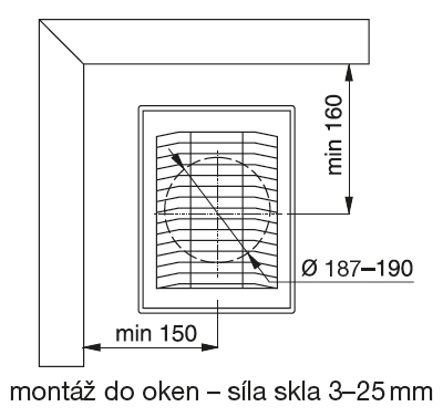 ![]() | Montáž Montáž se provádí do okna s jednoduchým nebo dvojitým zasklením o síle 3 až 25 mm. Pomocí 3 svorníků lze ventilátor namontovat jako nástěnný ventilátor pro přívod nebo odvod vzduchu přes stěnu. Montáž je možná do stěn se sílou 25 až 300 mm. | |