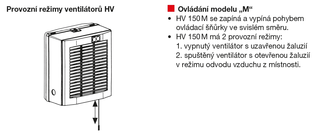 ![]() | Regulace otáček HV 150 M se zapíná a vypíná pohybem ovládací šňůrky ve svislém směru a má 2 provozní režimy: 1. vypnutý ventilátor s uzavřenou žaluzií 2. spuštěný ventilátor s otevřenou žaluzií v režimu odvodu vzduchu z místnosti. | |