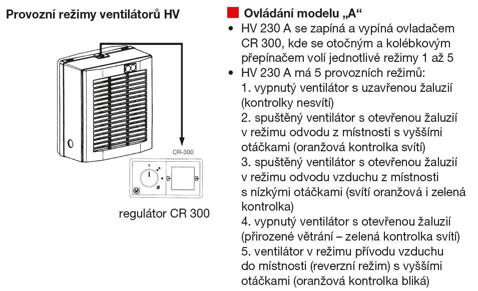 ![]() | Regulace otáček HV 230 A se zapíná a vypíná ovladačem CR 300, kde se otočným a kolébkovým přepínačem volí jednotlivé režimy 1 až 5. 1. vypnutý ventilátor s uzavřenou žaluzií (kontrolky nesvítí) 2. spuštěný ventilátor s otevřenou žaluzií v režimu odvodu z místnosti s vyššími otáčkami (oranžová kontrolka svítí) 3. spuštěný ventilátor s otevřenou žaluzií v režimu odvodu vzduchu z místnosti s nízkými otáčkami (svítí oranžová i zelená kontrolka) 4. vypnutý ventilátor s otevřenou žaluzií (přirozené větrání – zelená kontrolka svítí) 5. ventilátor v režimu přívodu vzduchu do místnosti (reverzní režim) s vyššími otáčkami (oranžová kontrolka bliká) | |