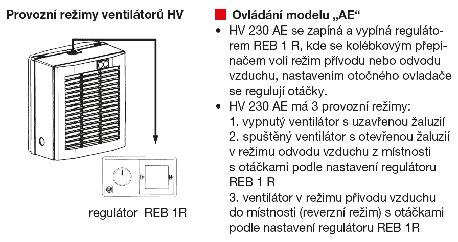 ![]() | Regulace otáček HV 230 AE se zapíná a vypíná regulátorem REB 1 R, kde se kolébkovým přepínačem volí režim přívodu nebo odvodu vzduchu, nastavením otočného ovladače se regulují otáčky. HV 230 AE má 3 provozní režimy: 1. vypnutý ventilátor s uzavřenou žaluzií 2. spuštěný ventilátor s otevřenou žaluzií v režimu odvodu vzduchu z místnosti s otáčkami podle nastavení regulátoru REB 1 R 3. ventilátor v režimu přívodu vzduchu do místnosti (reverzní režim) s otáčkami podle nastavení regulátoru REB 1R | |