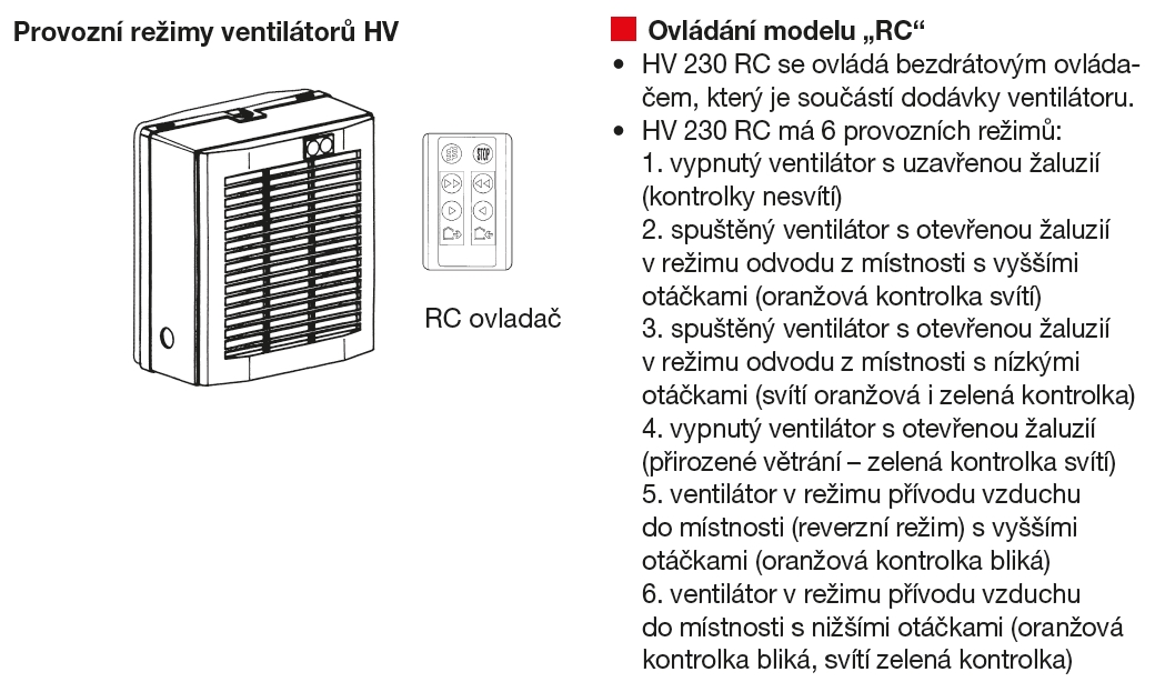 ![]() | Regulace otáček HV 230 RC se ovládá bezdrátovým ovládačem, který je součástí dodávky ventilátoru.HV 230 RC má 6 provozních režimů: 1. vypnutý ventilátor s uzavřenou žaluzií (kontrolky nesvítí) 2. spuštěný ventilátor s otevřenou žaluzií v režimu odvodu z místnosti s vyššími otáčkami (oranžová kontrolka svítí) 3. spuštěný ventilátor s otevřenou žaluzií v režimu odvodu z místnosti s nízkými otáčkami (svítí oranžová i zelená kontrolka) 4. vypnutý ventilátor s otevřenou žaluzií (přirozené větrání – zelená kontrolka svítí) 5. ventilátor v režimu přívodu vzduchu do místnosti (reverzní režim) s vyššími otáčkami (oranžová kontrolka bliká) 6. ventilátor v režimu přívodu vzduchu do místnosti s nižšími otáčkami (oranžová kontrolka bliká, svítí zelená kontrolka) | |