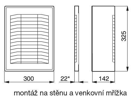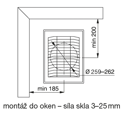 ![]() | Montáž Montáž se provádí do okna s jednoduchým nebo dvojitým zasklením o síle 3 až 25 mm. Pomocí 3 svorníků lze ventilátor namontovat jako nástěnný ventilátor pro přívod nebo odvod vzduchu přes stěnu. Montáž je možná do stěn se sílou 25 až 300 mm. | |
