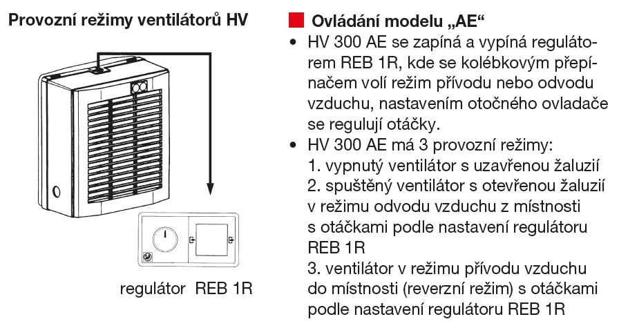 ![]() | Regulace otáček HV 300 AE se zapíná a vypíná regulátorem REB 1R, kde se kolébkovým přepínačem volí režim přívodu nebo odvodu vzduchu, nastavením otočného ovladače se regulují otáčky. HV 300 AE má 3 provozní režimy: 1. vypnutý ventilátor s uzavřenou žaluzií 2. spuštěný ventilátor s otevřenou žaluzií v režimu odvodu vzduchu z místnosti s otáčkami podle nastavení regulátoru REB 1R 3. ventilátor v režimu přívodu vzduchu do místnosti (reverzní režim) s otáčkami podle nastavení regulátoru REB 1R | |