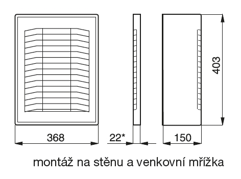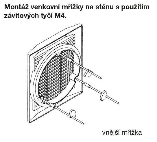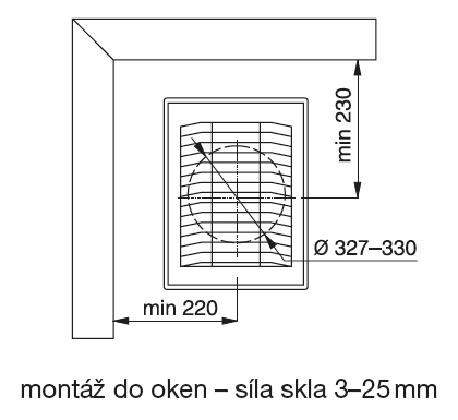 ![]() | Montáž Montáž se provádí do okna s jednoduchým nebo dvojitým zasklením o síle 3 až 25 mm. Pomocí 3 svorníků lze ventilátor namontovat jako nástěnný ventilátor pro přívod nebo odvod vzduchu přes stěnu. Montáž je možná do stěn se sílou 25 až 300 mm. | |