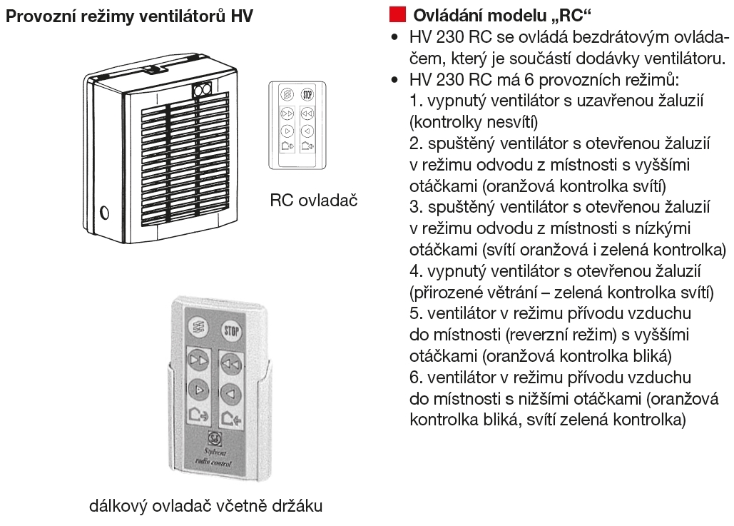![]() | Regulace otáček HV 300 A se zapíná a vypíná ovladačem CR 300, kde se otočným a kolébkovým přepínačem volí jednotlivé režimy 1 až 5 1. vypnutý ventilátor s uzavřenou žaluzií (kontrolky nesvítí) 2. spuštěný ventilátor s otevřenou žaluzií v režimu odvodu z místnosti s vyššími otáčkami (oranžová kontrolka svítí) 3. spuštěný ventilátor s otevřenou žaluzií v režimu odvodu vzduchu z místnosti s nízkými otáčkami (svítí oranžová i zelená kontrolka) 4. vypnutý ventilátor s otevřenou žaluzií (přirozené větrání – zelená kontrolka svítí) 5. ventilátor v režimu přívodu vzduchu do místnosti (reverzní režim) s vyššími otáčkami (oranžová kontrolka bliká) | |
