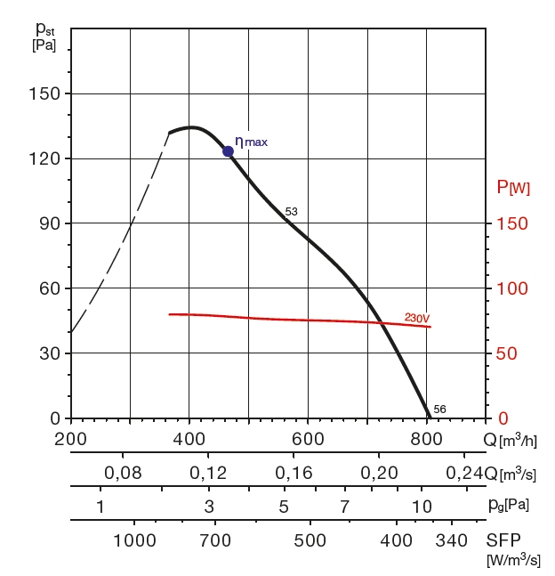 | Ø připojení [mm] | otáčky [min-1] | průtok (0 Pa) [m3/h] | výkon [W] | napětí [V] | proud [A] | max. teplota [°C] | akust. tlak [dB(A)] | hmotnost [kg] | regulátor |