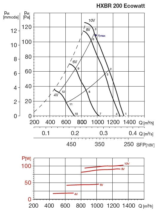 ![]() | Hluk Hluk emitovaný ventilátorem je uveden v tabulkách, měření je prováděno ve vzdálenosti rovné trojnásobku průměru oběžného kola (minimálně však 1,5 m) na straně sání. | |