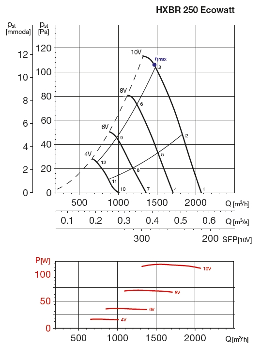 ![]() | Hluk Hluk emitovaný ventilátorem je uveden v tabulkách, měření je prováděno ve vzdálenosti rovné trojnásobku průměru oběžného kola (minimálně však 1,5 m) na straně sání. | |