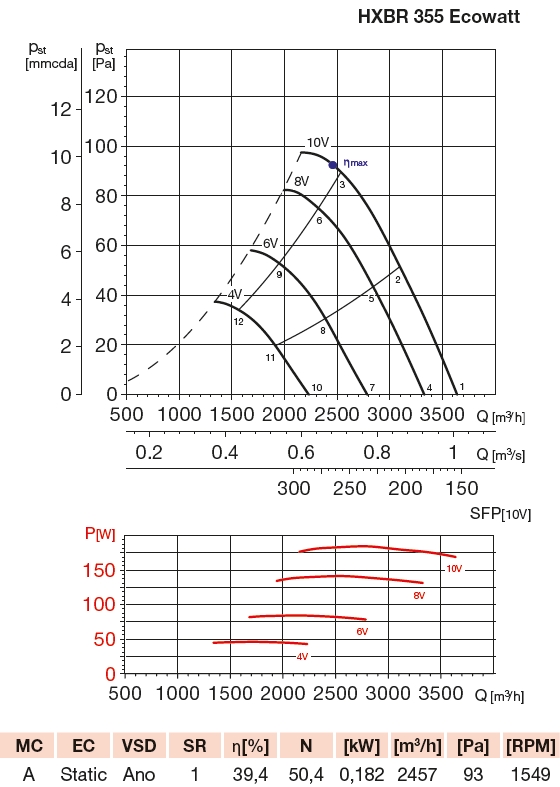 ![]() | Hluk Hluk emitovaný ventilátorem je uveden v tabulkách, měření je prováděno ve vzdálenosti rovné trojnásobku průměru oběžného kola (minimálně však 1,5 m) na straně sání. | |