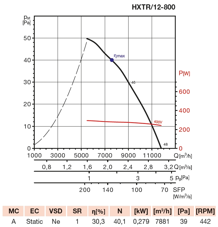 ![]() | Hluk Hluk emitovaný ventilátorem je uveden v tabulkách, měření je prováděno ve vzdálenosti rovné trojnásobku průměru oběžného kola (minimálně však 1,5 m) na straně sání. | |