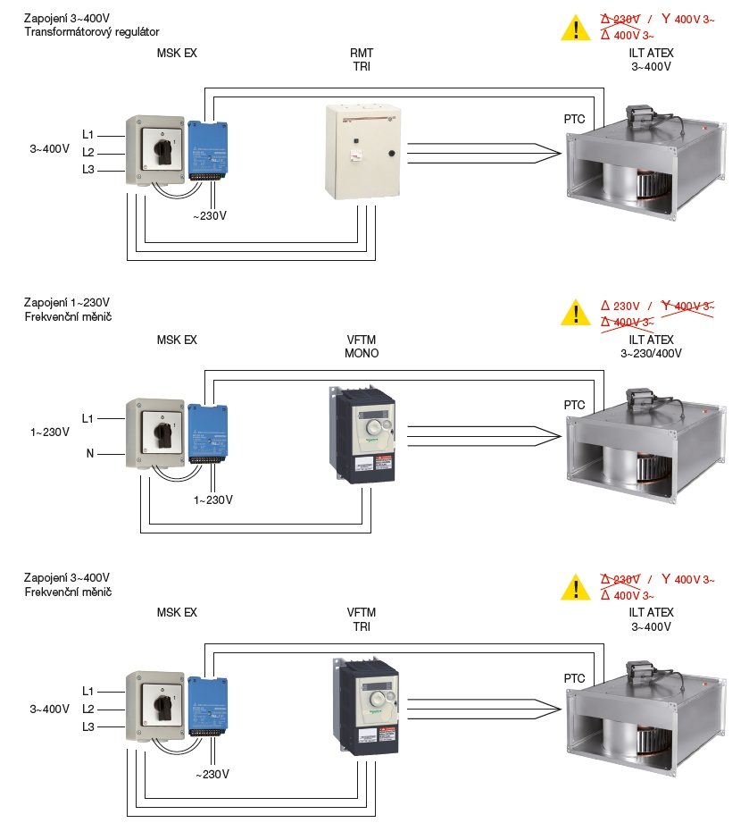 ![]() | Pokyny Pozor, ventilátory jsou ve speciálním provedení pro ČR. Nelze použít náhradní díly standardně dodávané výrobcem či obchodními organizacemi. Pro osazení jistících prvků a tím bezpečný provoz ventilátorů jsou rozhodujícím podkladem hodnoty In, Ia/In a te uvedené v certifikátech ventilátorů. Po dodání ventilátoru je nutné tyto hodnoty pečlivě zkontrolovat. | |