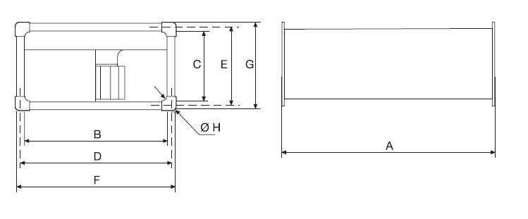 ![]() | Skříň Skříň ventilátoru je z ocelového, galvanicky pozinkovaného plechu, opatřena přírubami pro upevnění do čtyřhranného potrubí. Na skříni je revizní víko, po jehož demontáži je přístupné oběžné kolo. | |