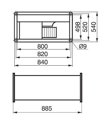 ![]() | Skříň ventilátoru je z ocelového, galvanicky pozinkovaného plechu, skříň je opatřena přírubami pro upevnění do čtyřhranného potrubí. Na skříni je revizní víko, po jehož demontáži je přístupné oběžné kolo. | |