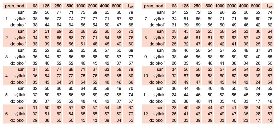 * výtlak/sání/do okolí. Akustický tlak je měřen ve vzdálenosti 1,5 m ve volném akustickém poli, ve středním pracovním bodě výkonové křivky