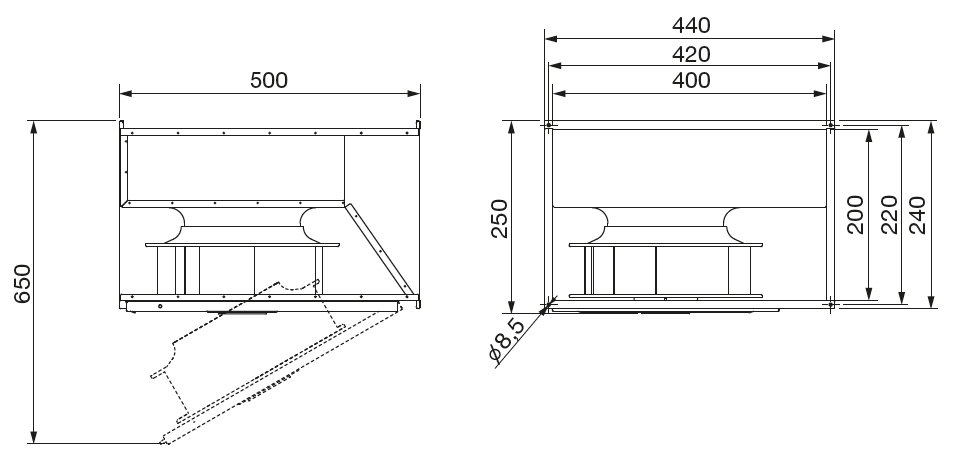 ![]() | Skříň Skříň je z ocelového, galvanicky pozinkovaného plechu, skříň je opatřena přírubami pro upevnění do čtyřhranného potrubí. Na skříni je revizní víko, po jehož demontáži je přístupný motor a oběžné kolo. | |