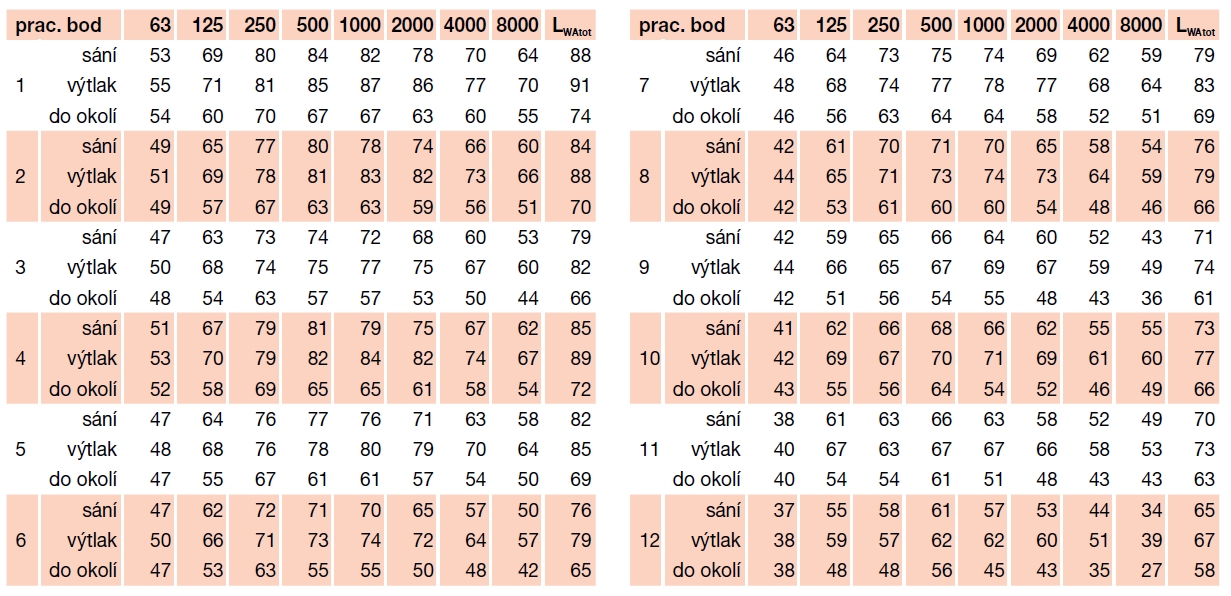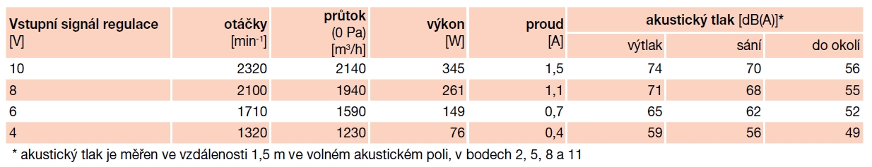 * výtlak/sání/do okolí. Akustický tlak je měřen ve vzdálenosti 1,5 m ve volném akustickém poli, ve středním pracovním bodě výkonové křivky