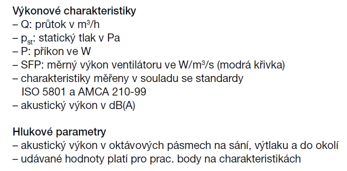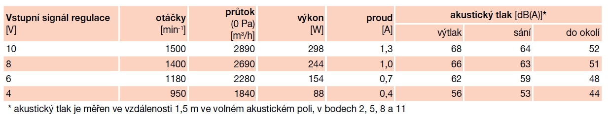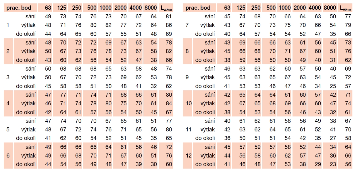 * výtlak/sání/do okolí. Akustický tlak je měřen ve vzdálenosti 1,5 m ve volném akustickém poli, ve středním pracovním bodě výkonové křivky