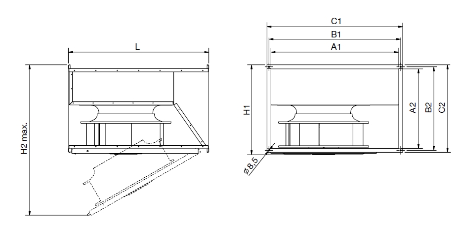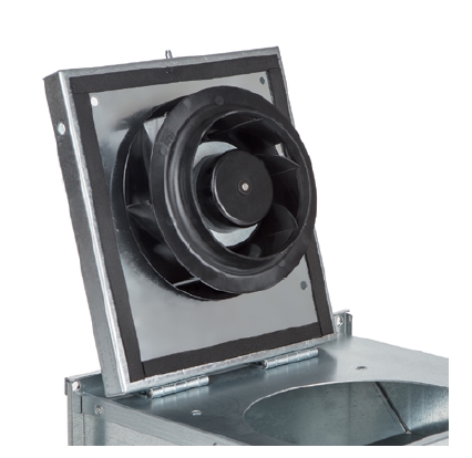 ![]() | Skříň Skříň je z ocelového, galvanicky pozinkovaného plechu, skříň je opatřena přírubami pro upevnění do čtyřhranného potrubí. Na skříni je revizní víko, po jehož demontáži je přístupný motor a oběžné kolo. | |