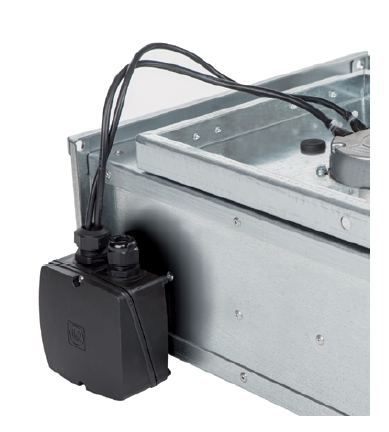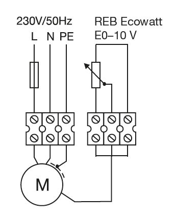 ![]() | Regulace otáček Regulace otáček se provádí pomocí potenciometru umístěného ve svorkovnici nebo externím ovládáním REB-ECOWATT. Dále analogovým vstupem 0–10 V od čidla teploty, vlhkosti nebo CO2. | |
