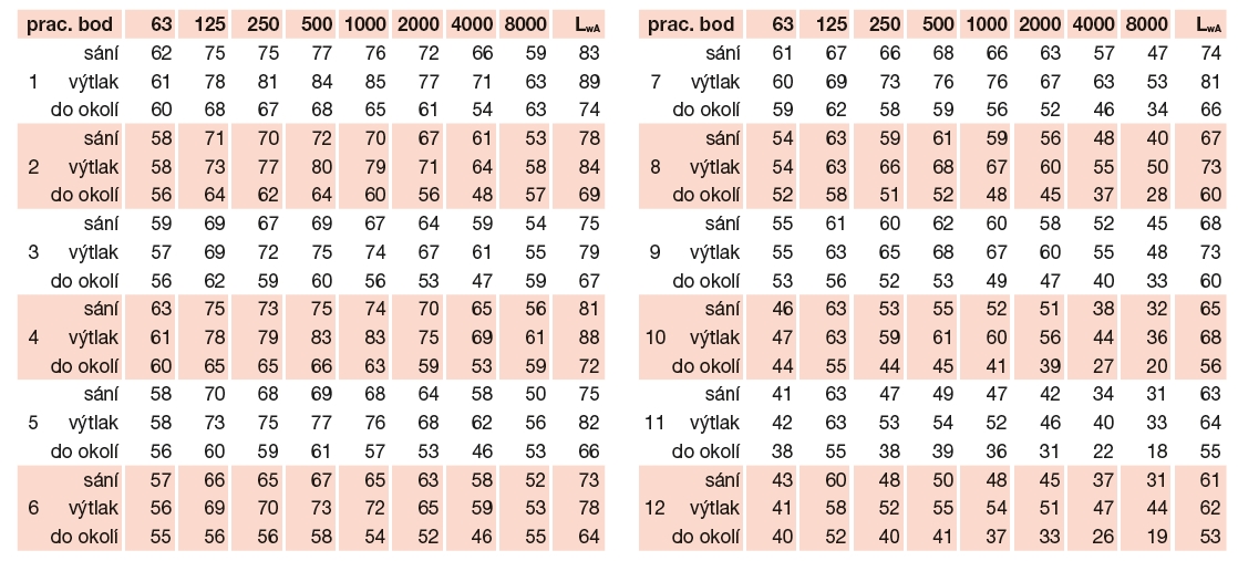 * výtlak/sání/do okolí. Akustický tlak je měřen ve vzdálenosti 1,5 m ve volném akustickém poli, ve středním pracovním bodě výkonové křivky