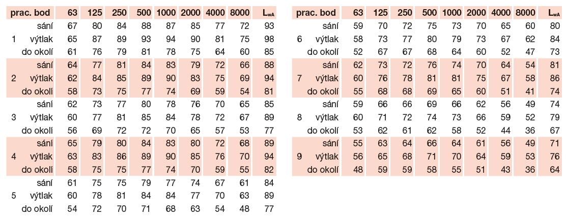 * výtlak/sání/do okolí. Akustický tlak je měřen ve vzdálenosti 1,5 m ve volném akustickém poli, ve středním pracovním bodě výkonové křivky