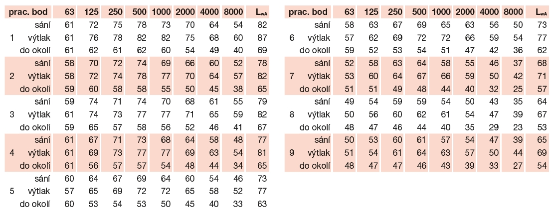 * výtlak/sání/do okolí. Akustický tlak je měřen ve vzdálenosti 1,5 m ve volném akustickém poli, ve středním pracovním bodě výkonové křivky