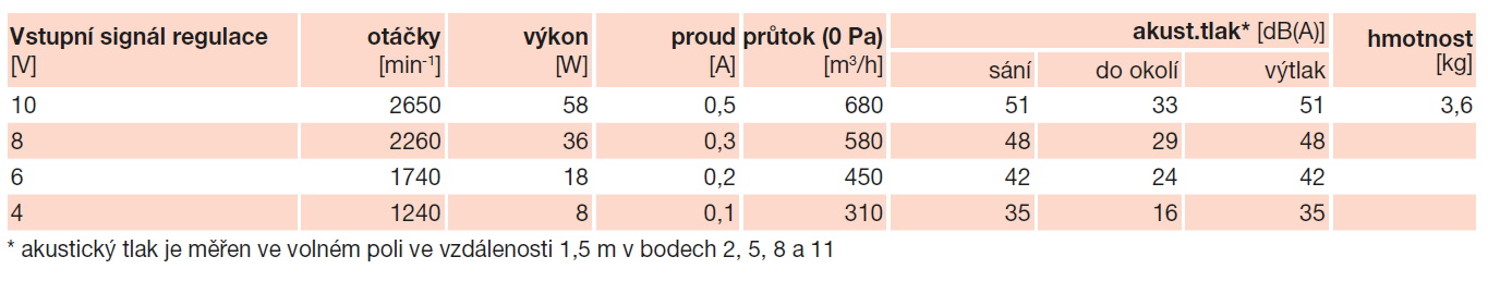 | otáčky [min-1] | výkon [W] | napětí [V] | proud [A] | průtok (0 Pa) [m3/h] | teplota [°C] | akust. tlak* [dB(A)] | hmotnost [kg] | regulace [kg] |