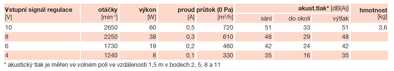 | otáčky [min-1] | výkon [W] | napětí [V] | proud [A] | průtok (0 Pa) [m3/h] | teplota [°C] | akust. tlak* [dB(A)] | hmotnost [kg] | regulace [kg] |