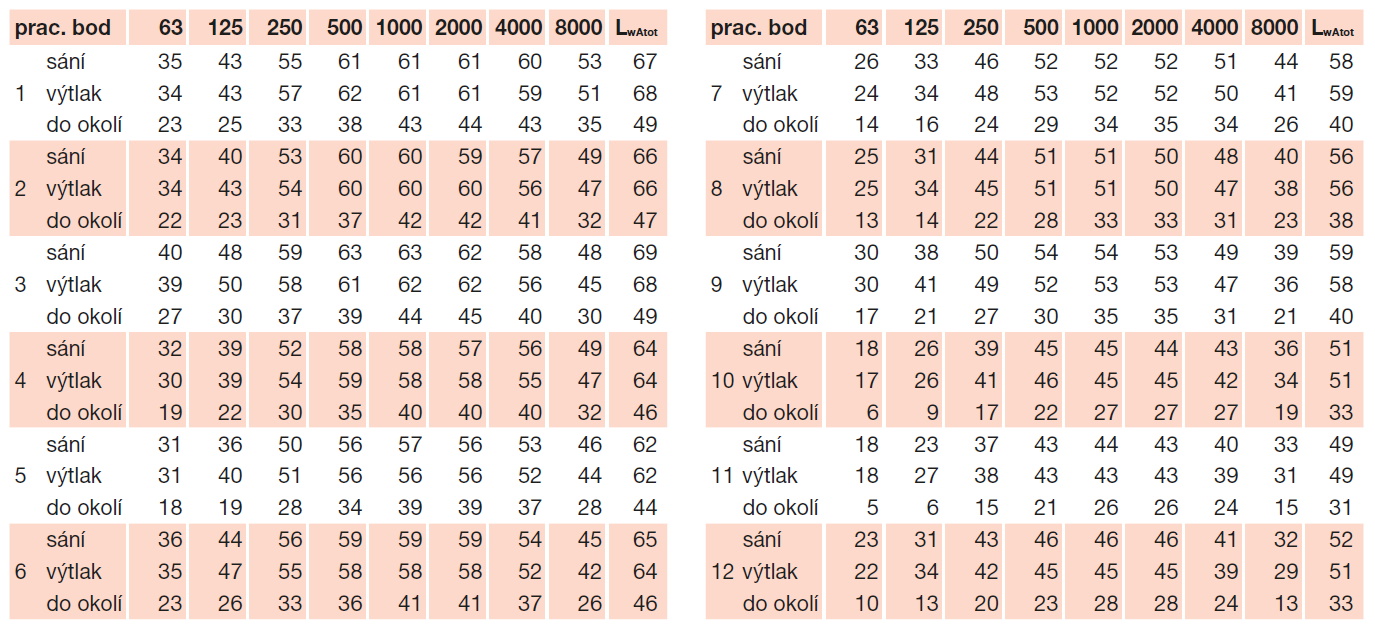 * akustický tlak je měřen ve volném poli ve vzdálenosti 1,5 m v bodech 2, 5, 8 a 11; sání / do okolí / výtlak