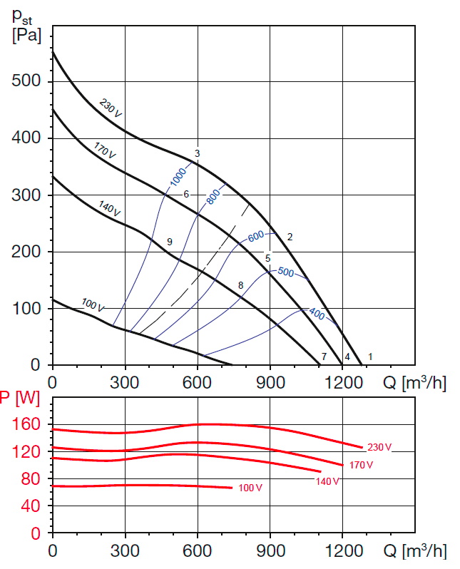 | otáčky [min-1] | výkon [W] | napětí [V] | proud [A] | průtok (0 Pa) [m3/h] | teplota [°C] | akust. tlak* [dB(A)] | hmotnost [kg] | regulace [kg] |