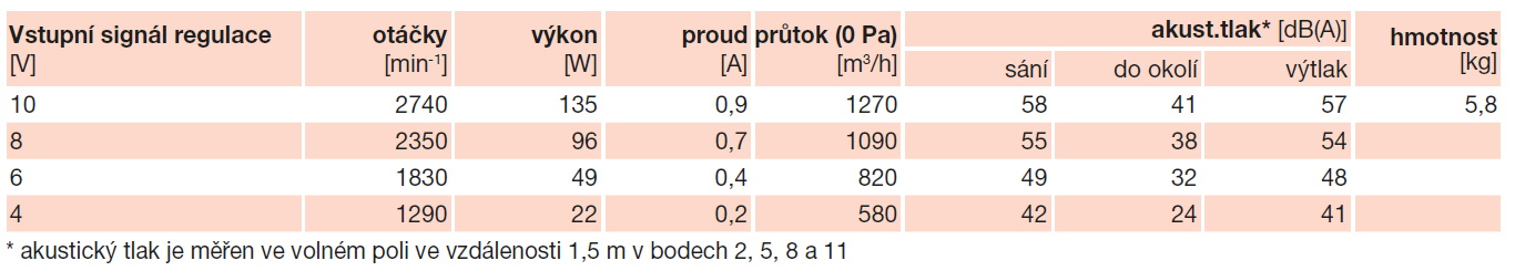 | otáčky [min-1] | výkon [W] | napětí [V] | proud [A] | průtok (0 Pa) [m3/h] | teplota [°C] | akust. tlak* [dB(A)] | hmotnost [kg] | regulace [kg] |