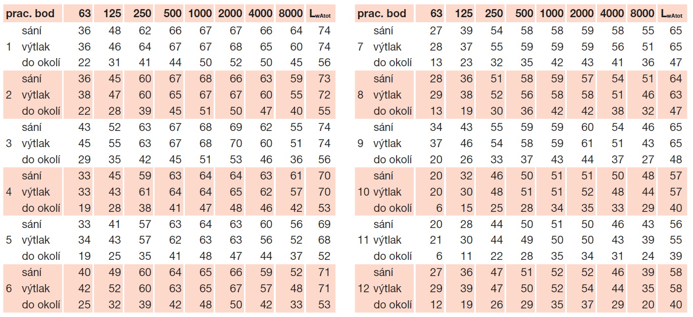 * akustický tlak je měřen ve volném poli ve vzdálenosti 1,5 m v bodech 2, 5, 8 a 11; sání / do okolí / výtlak