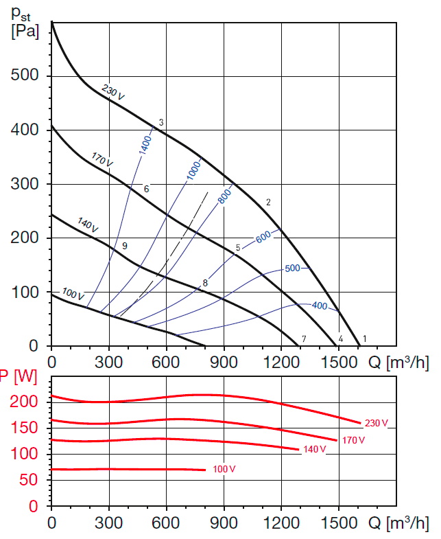 | otáčky [min-1] | výkon [W] | napětí [V] | proud [A] | průtok (0 Pa) [m3/h] | teplota [°C] | akust. tlak* [dB(A)] | hmotnost [kg] | regulace [kg] |