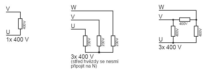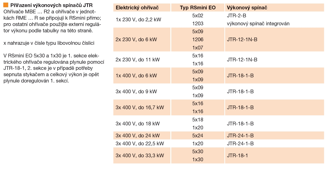 ![]() | Informace Triakové spínače JTR umožňují bezkontaktní spínání elektrického ohřívače. Toto řešení přináší některé výhody: • spolehlivost polovodičových součástek – zařízení nevyžaduje žádnou obsluhu ani zvláštní údržbu • napětí je spínáno při průchodu nulou – minimální rušení do sítě • bezhlučný chod (v porovnání se stykači) • plynulé řízení topného výkonu od 0 do 100% na základě ovládacího napětí 0 až 10 V Přiřazení ohřívačů: • JTR-2-B – 1x230 V do 2,3 kW • JTR-12-1N-B – 1x230 V nebo 2x230 V do 6/12 kW • JTR-12-1N-B – 1x400 V nebo 3x400 V do 12 kW • JTR-18-1-B – 1x400 V nebo 3x400 V do 18 kW • JTR-24-1-B – 3x400 V do 24 kW 3-fázové ohřívače musí být zapojeny do trojúhelníku nebo do hvězdy (střed hvězdy nesmí být připojen ke střednímu vodiči). U ohřívačů na 3x 400 V musí být zátěž rozdělena mezi jednotlivé fáze symetricky, ve všech fázích musí tedy ohřívač odebírat stejný proud. Jmenovitý proud triakového spínače nesmí být překročen. • doporučený typ regulátoru: RSmini EO, UNIREG Poznámka: JTR nejsou potřeba pro MBE … R2 a RME … R. JTR-18-1 má stejné parametry jako JTR-18-1-B, ale jiný způsob řízení výkonu. Prodává se pouze jako příslušenství k RSmini EO 5x30 a RSmini EO 1x30. | |
